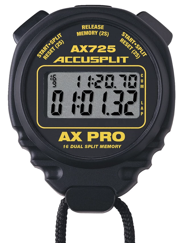 Accusplit Black AX725 Series Stopwatch feature a high impact durable case, buttons that are tested over a million cycles without failure, super-large 2 giant line readouts and a 5 year lithium battery. High-quality affordable stopwatch includes time-out, 10-hour timing range, Cum and Lap splits, 16-memory and water resistance to 100 feet. Sold individually.