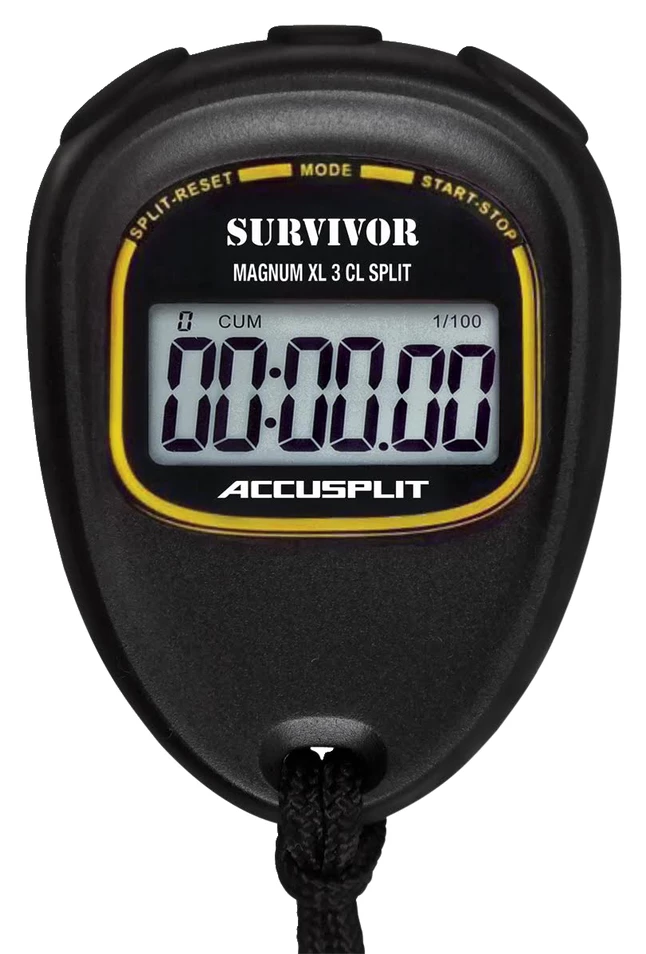Accusplit S3 Series Survivor III Stopwatch is an easy-to-use split stopwatch that is water-resistant. Stopwatch with durable round black case has a large Magnum liquid crystal display for easy visibility. It offers 5 year battery life and a timing range of 10 hours. Stopwatch comes with lanyard, battery and instructions.