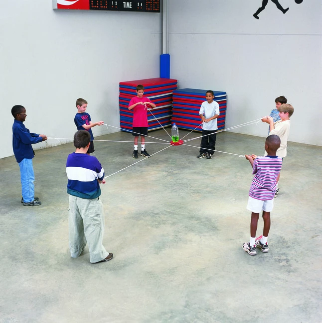 Nuclear Waste Transfer gives students an exciting game scenario: With the cold war over, the munitions plant where you work no longer needs to manufacture nuclear warheads. However there is a serious problem. What is to be done with the unstable nuclear waste that still remains? The answer is to move it to the safe storage facility that has just been built across the road; move it, that is, without dropping or shaking, or BOOM! Set includes one wooden octagonal isotope mover, four 16 foot transportation ropes, and two 18 inch square SpaceStations (start and target). Use a 2-liter soda bottle as your nuclear waste. Adding water adds to the challenge. Activity guide is included.