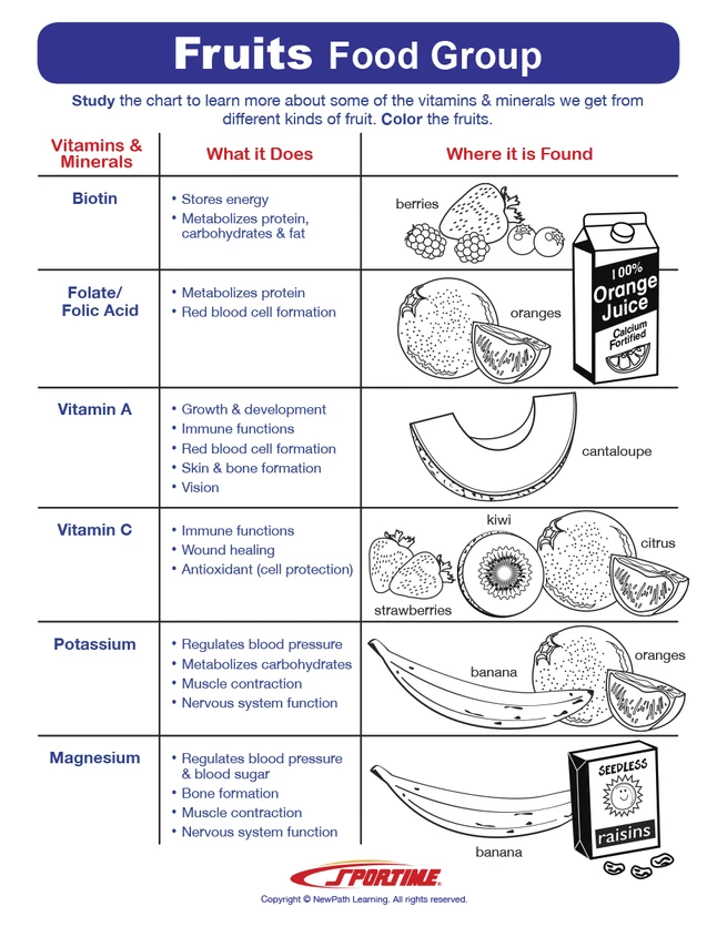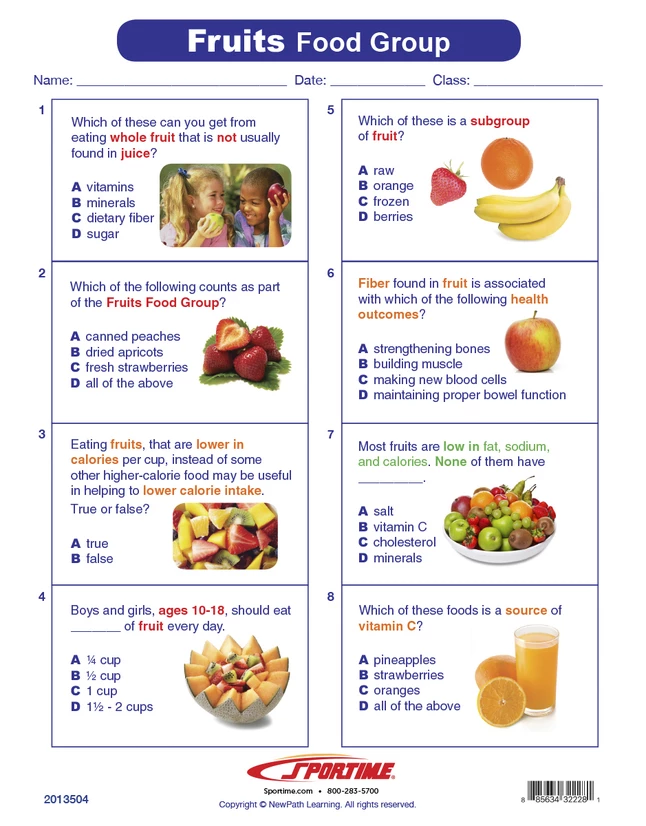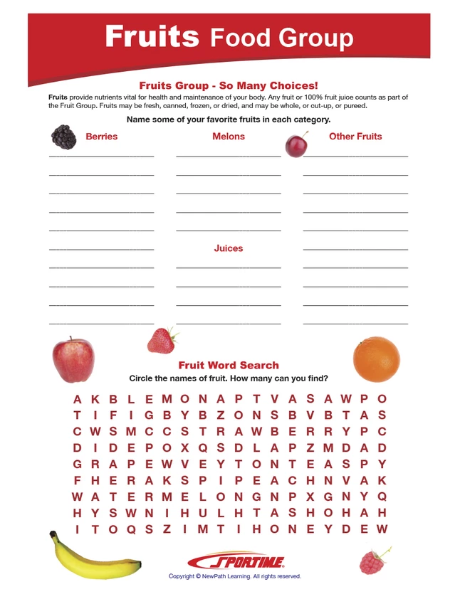 - Fruits food group learning guide is an excellent nutrition education teaching aid to use alone or conjoined with other MyPlate or food-related Sportime Visual Learning Guides (sold separately)