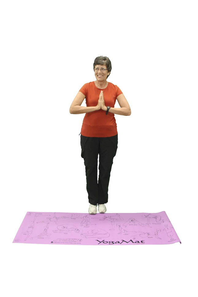 - Printed 16 yoga poses directly on surface help students model moves at their own comfort and pace