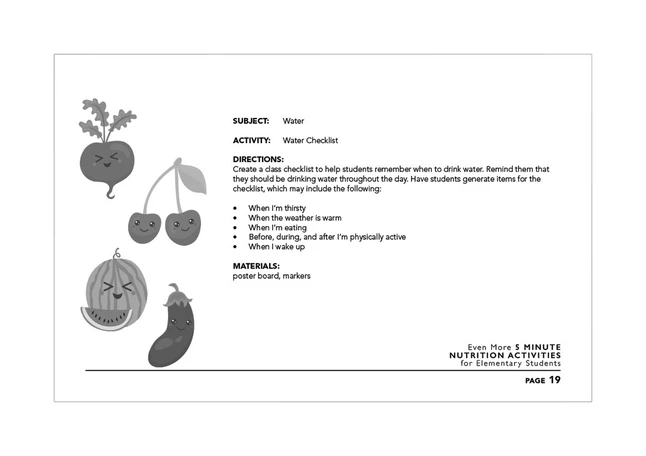Introduce a lesson or utilize extra minutes of class time with 50 quick and effective education and teaching activities lasting 5 minutes or less with Even More 5 Minute Nutrition Activities for Elementary Students. 8-1/2 x 5-1/2 in, spiral bound, 50 activities. .